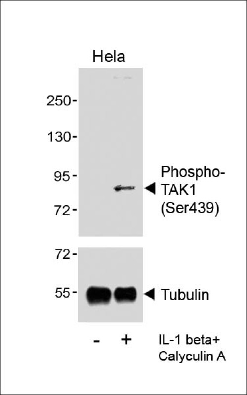 Phospho-TAK1 (Ser439) antibody is a specialized tool used to detect the activated form of Transforming Growth Factor β-Activated Kinase 1 (TAK1), a key regulator in cellular signaling pathways. TAK1. a member of the mitogen-activated protein kinase kinase kinase (MAP3K) family, plays a central role in mediating signals from pro-inflammatory cytokines (e.g., TNF-α, IL-1), Toll-like receptors (TLRs), and stress stimuli. Its activation is critical for downstream signaling cascades, including NF-κB and MAPK pathways, which influence cell survival, inflammation, and immune responses.