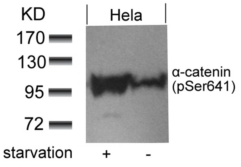The antibody specifically recognizes α-catenin when phosphorylated at Ser641. enabling researchers to investigate dynamic changes in cell adhesion during development, wound healing, or cancer progression. Studies suggest this phosphorylation event may be mediated by kinases like Rho-associated kinase (ROCK) in response to mechanical tension or signaling pathways involving RhoA. Its detection is particularly relevant in cancer research, as dysregulated α-catenin phosphorylation correlates with metastatic potential and loss of cell polarity.