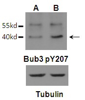 | Immunogen | Peptide sequence around phosphorylation site of Tyrosine 207 (V-E-Y(p)-L-D) derived from Human Bub3. |