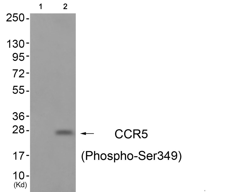 The CCR5 (Phospho-Ser349) antibody is a specialized tool used to detect the phosphorylated form of the C-C chemokine receptor type 5 (CCR5) at serine residue 349. CCR5. a G protein-coupled receptor (GPCR), plays a critical role in immune cell migration and inflammation by binding chemokines like CCL3. CCL4. and CCL5. Phosphorylation of Ser349 is a key post-translational modification linked to receptor desensitization, internalization, and downstream signaling regulation. This site-specific phosphorylation is often triggered by ligand binding or cellular activation, facilitating interactions with β-arrestin to terminate signaling or redirect pathways, such as MAPK or PI3K/Akt cascades.