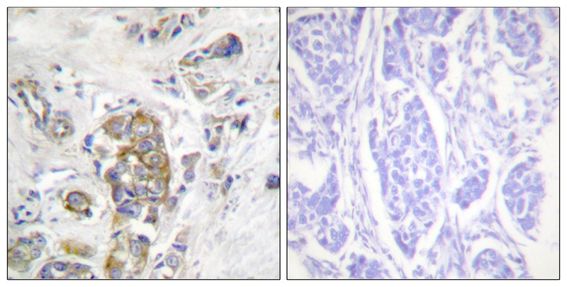 The ITGB4 (Phospho-Tyr1510) antibody detects the phosphorylated form of integrin beta-4 (ITGB4) at tyrosine residue 1510. ITGB4 is a transmembrane receptor subunit that pairs with integrin alpha-6 (ITGA6) to form the α6β4 heterodimer, primarily expressed in epithelial cells. Unlike other integrins, β4 contains a unique cytoplasmic domain with multiple tyrosine phosphorylation sites, including Tyr1510. which play critical roles in regulating signaling pathways linked to cell adhesion, migration, and survival. Phosphorylation at Tyr1510 is induced by receptor tyrosine kinases (e.g., EGFR, Met) or stress conditions, promoting interactions with adaptor proteins like Shc or Grb2 to activate downstream effectors such as PI3K/Akt and MAPK. This post-translational modification is associated with enhanced tumor progression, epithelial-mesenchymal transition (EMT), and resistance to apoptosis in cancers like breast, lung, and pancreatic carcinomas.