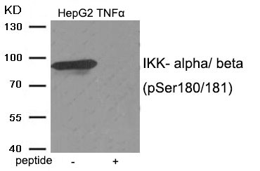 The IKK-alpha/beta (Phospho-Ser180/181) antibody detects the phosphorylated forms of IκB kinase alpha (IKKα) and beta (IKKβ) at serine residues 180 and 181. respectively. These kinases are core components of the IKK complex, a central regulator of the NF-κB signaling pathway. Phosphorylation at these conserved serine residues within the activation loop is critical for their enzymatic activity, enabling the complex to phosphorylate IκB proteins. This triggers the degradation of IκB, releasing NF-κB transcription factors to translocate into the nucleus and drive the expression of genes involved in inflammation, immune responses, and cell survival.