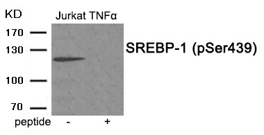 Research using this antibody focuses on metabolic disorders (e.g., obesity, diabetes, fatty liver disease) and cancer, where dysregulated lipid synthesis is implicated. It is widely employed in techniques like Western blotting, immunofluorescence, and immunoprecipitation to study SREBP-1 activation under varying metabolic conditions or therapeutic interventions. Proper validation, including phosphatase treatment or mutant controls, ensures specificity in distinguishing phosphorylated SREBP-1 from its unmodified form. Understanding Ser439 phosphorylation provides insights into metabolic homeostasis and disease mechanisms.