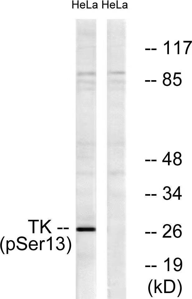 The TK (Phospho-Ser13) antibody is a specific immunological tool designed to detect thymidine kinase 1 (TK1) phosphorylated at serine residue 13. TK1. a key enzyme in the salvage pathway of DNA synthesis, catalyzes the phosphorylation of thymidine to thymidine monophosphate, supporting cell cycle progression. Its activity and expression are tightly regulated during the cell cycle, peaking during S-phase. Phosphorylation at Ser13 is associated with TK1's enzymatic activation and stability, particularly in proliferating cells. This post-translational modification may serve as a biomarker for cellular proliferation, making the antibody valuable in cancer research, where elevated TK1 levels correlate with tumor aggressiveness and poor prognosis.