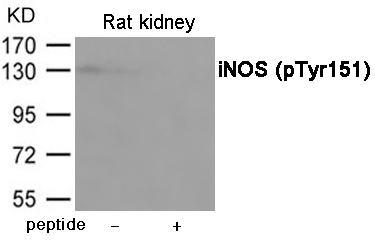 The inducible nitric oxide synthase (iNOS), also known as NOS2. is an enzyme responsible for producing nitric oxide (NO) in response to inflammatory stimuli, such as cytokines or pathogens. Its activity is tightly regulated at transcriptional and post-translational levels, including phosphorylation. Phosphorylation at tyrosine residue 151 (Tyr151) has been identified as a key modification modulating iNOS function. This site-specific phosphorylation may influence enzyme stability, subcellular localization, or interactions with regulatory proteins, ultimately affecting NO output in conditions like sepsis, chronic inflammation, or cancer.