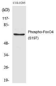 The FoxO4 (Phospho-Ser197) antibody is a specialized tool used to detect the phosphorylation status of the Forkhead box O4 (FoxO4) protein at serine residue 197. FoxO4. a member of the Forkhead box O (FoxO) transcription factor family, plays a critical role in regulating cellular processes such as apoptosis, oxidative stress response, cell cycle arrest, and metabolism. Its activity is tightly controlled by post-translational modifications, particularly phosphorylation, which modulates its subcellular localization and transcriptional activity. Phosphorylation at Ser197. often mediated by upstream kinases like Akt (Protein Kinase B) in response to insulin or growth factor signaling, promotes FoxO4's translocation from the nucleus to the cytoplasm, thereby inhibiting its transcriptional functions. This modification is a key regulatory mechanism in pathways linked to cellular survival, aging, and tumor suppression.