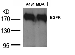 The EGFR (Ab-1197) goat antibody is a polyclonal antibody raised against a synthetic peptide corresponding to a region within the C-terminal domain of human epidermal growth factor receptor (EGFR). EGFR, a transmembrane tyrosine kinase receptor belonging to the ErbB family, plays a critical role in regulating cell proliferation, differentiation, and survival by binding to ligands such as EGF and TGF-α. Dysregulation of EGFR signaling is implicated in various cancers, making it a key therapeutic target.