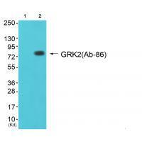 The GRK2 (Ab-86) antibody is commonly used to detect endogenous GRK2 protein levels in human, mouse, and rat samples. It recognizes an epitope within the C-terminal region of GRK2. allowing identification of the full-length protein (~80 kDa) in applications like Western blotting, immunoprecipitation, and immunofluorescence. Its specificity has been validated in knockout controls and functional studies, making it a reliable tool for investigating GRK2 expression patterns, cellular localization, and interaction partners.