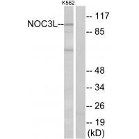 The NOC3L antibody targets the NOC3L protein (Nucleolar Complex Protein 3 Homolog Like), a conserved eukaryotic protein implicated in DNA replication and cell cycle regulation. Structurally, NOC3L shares homology with yeast Noc3p, a component of the origin recognition complex (ORC) involved in replication licensing. In humans, NOC3L interacts with ORC members and is critical for pre-replication complex assembly, ensuring proper DNA replication initiation. Dysregulation of NOC3L has been linked to genomic instability and oncogenesis, with overexpression observed in cancers like hepatocellular carcinoma and glioblastoma.