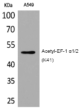The EF-1 α1/2 (Acetyl-Lys41) antibody is a specialized tool designed to detect the acetylated form of eukaryotic translation elongation factor 1 alpha (eEF1A) at lysine 41 (K41). eEF1A is a critical GTPase responsible for delivering aminoacyl-tRNAs to the ribosome during protein synthesis. Beyond its canonical role in translation, eEF1A participates in diverse non-canonical processes, including cytoskeletal regulation, apoptosis, and viral replication. Post-translational modifications (PTMs) such as acetylation are increasingly recognized as key regulators of eEF1A's multifunctional roles.